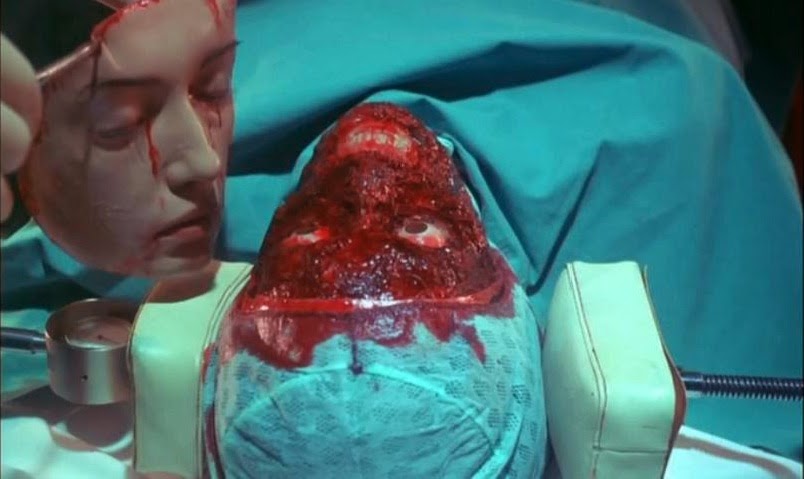 E Franco ainda filma não uma, mas DUAS cenas de retirada do rosto de vítimas diferentes, ambas mostradas em detalhes cirúrgicos (sem trocadilho), e ambas bastante eficientes e realistas. São momentos de virar o estômago, principalmente quando uma das operações dá errado e a pele começa a rasgar na hora da retirada - e com a "doadora" ainda viva, é claro!
